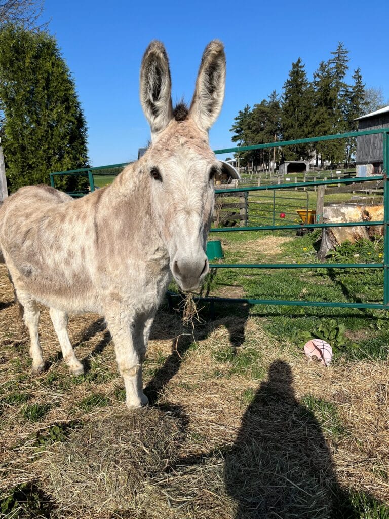 Demetri had not received proper veterinary or farrier care over his lifetime and arrived with overgrown hooves and a lot of weight on his body, which is very common for donkeys that are used as guard animals, as they often have the same diet as the cows. That diet is way too rich for a donkey.