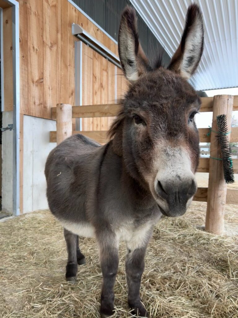 He came to the DSC as a jack (an intact male donkey), so, soon after his arrival he was castrated. Because he had been a jack his whole life, he has shown aggressive behaviours towards other donkeys and thus requires specific care and management.