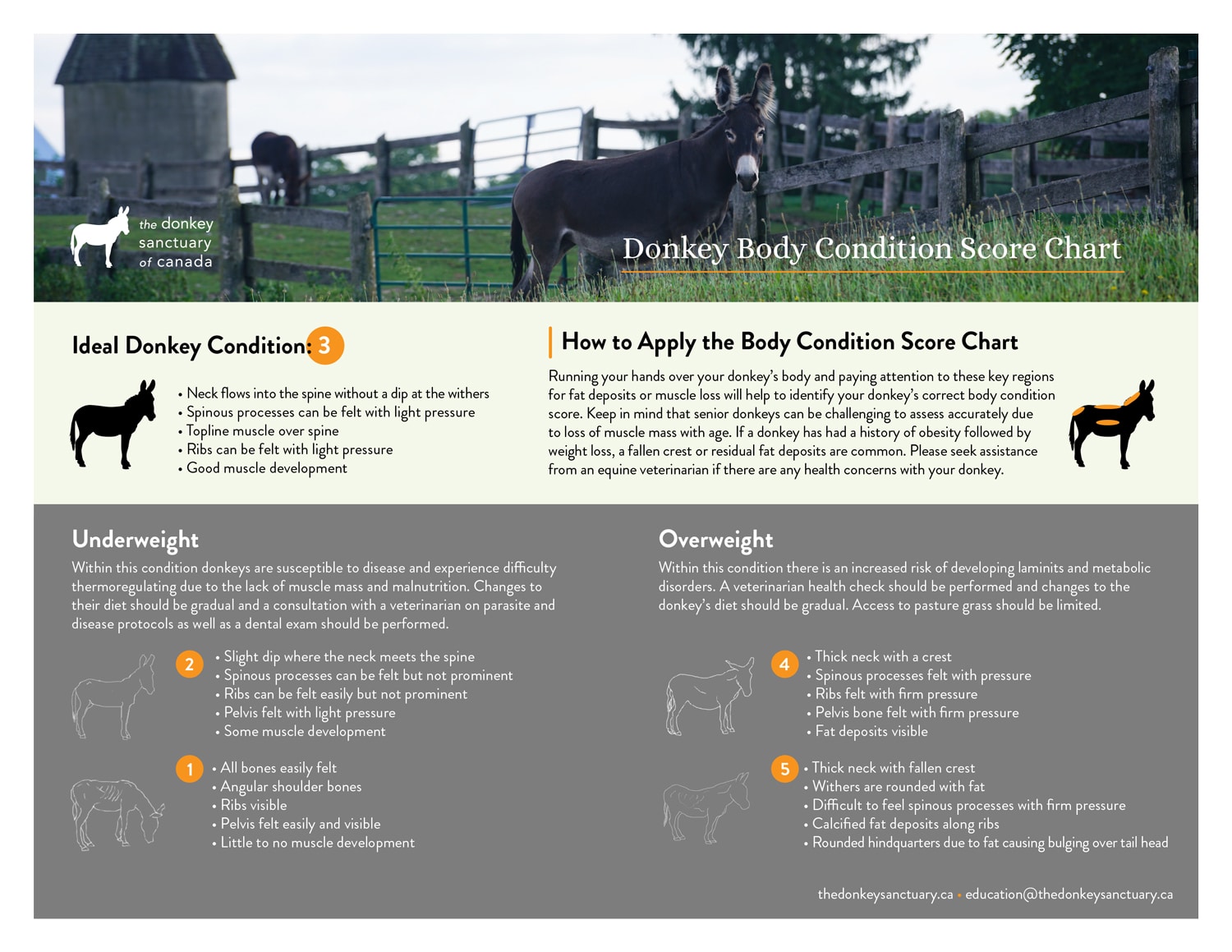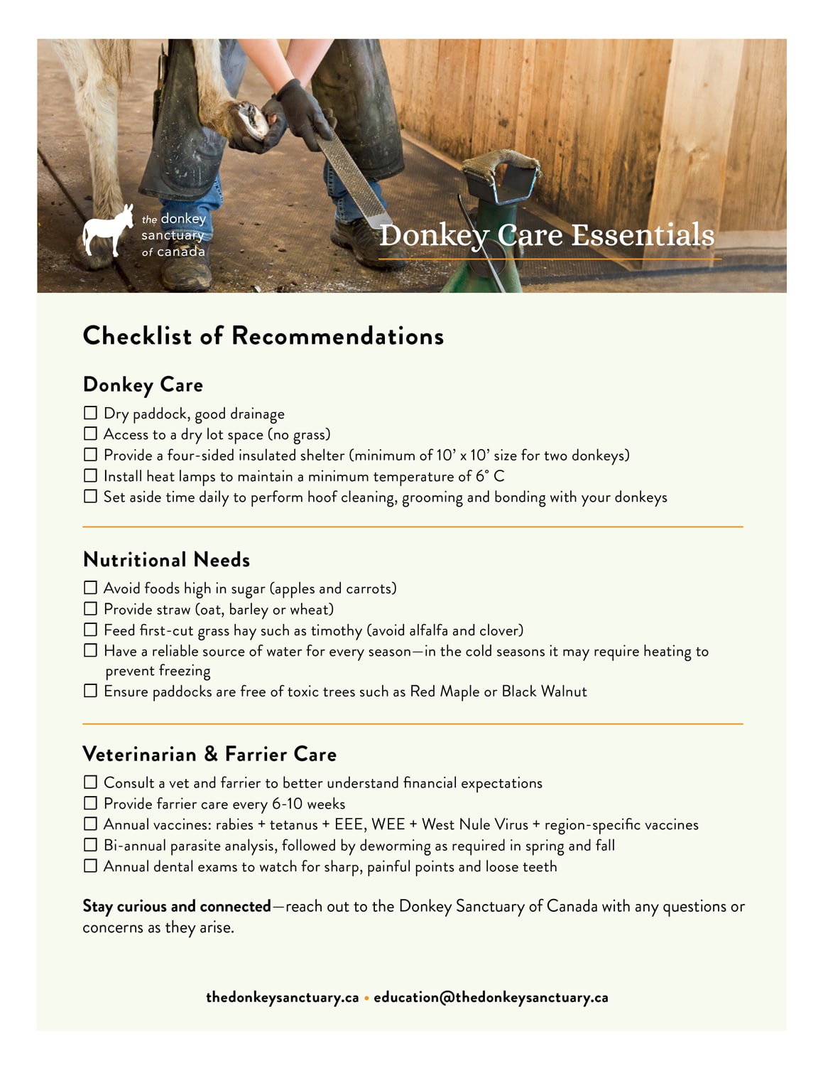 We make this knowledge freely available in order to improve donkey welfare everywhere, as well as to strengthen our community of donkey and mule caregivers. This growing library is made possible thanks to the generosity of DSC supporters, whose contributions make these resources available to owners across Canada and internationally, too.